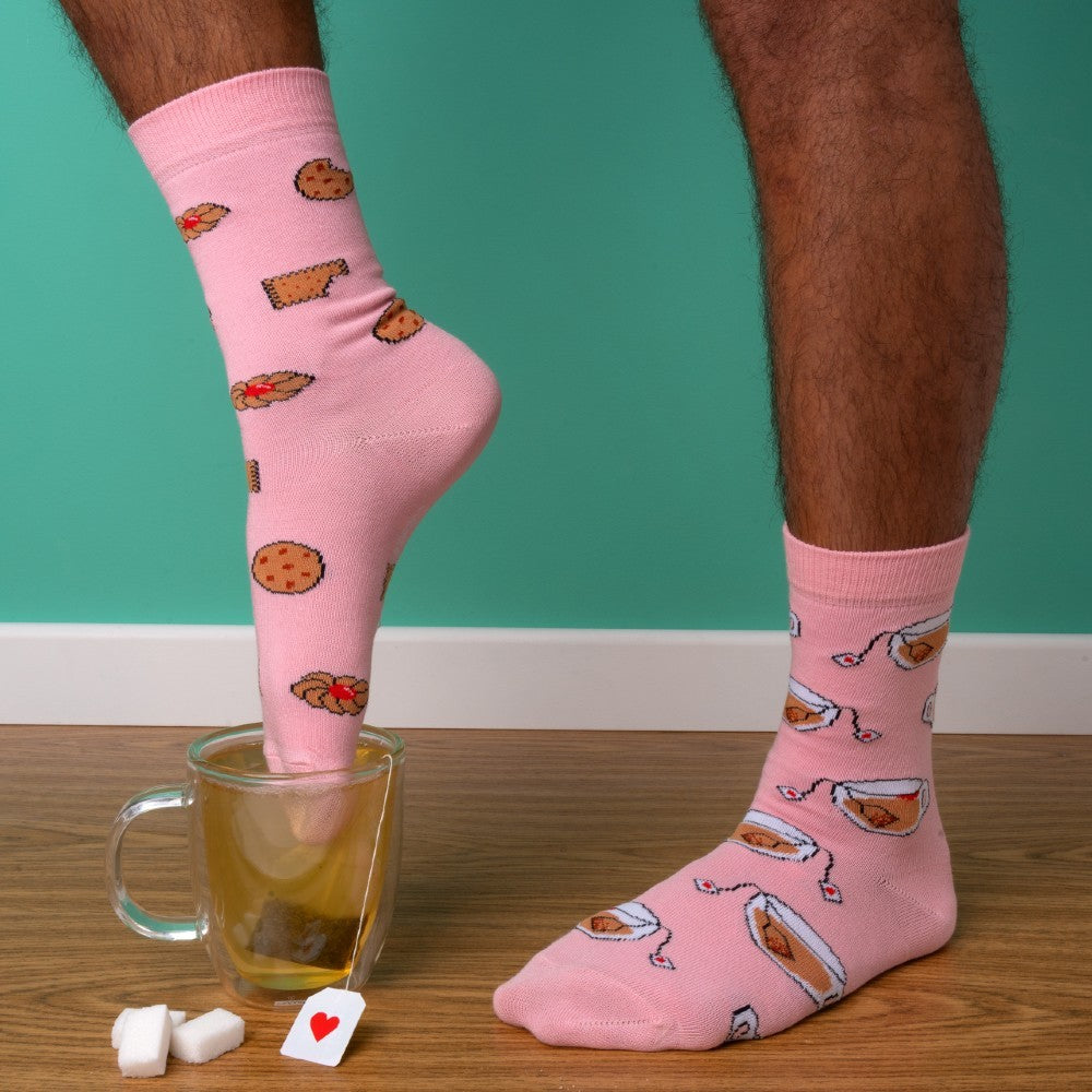 What would winter time be without comfy socks celebrating tea time? We love this mismatched pair with biscuits looking like our grandma’s ones on one side, and cute little teas brewing on the other side (probably a “night time” kind…). All of it on a pretty pink background to forget about the bad weather and cold temperatures.