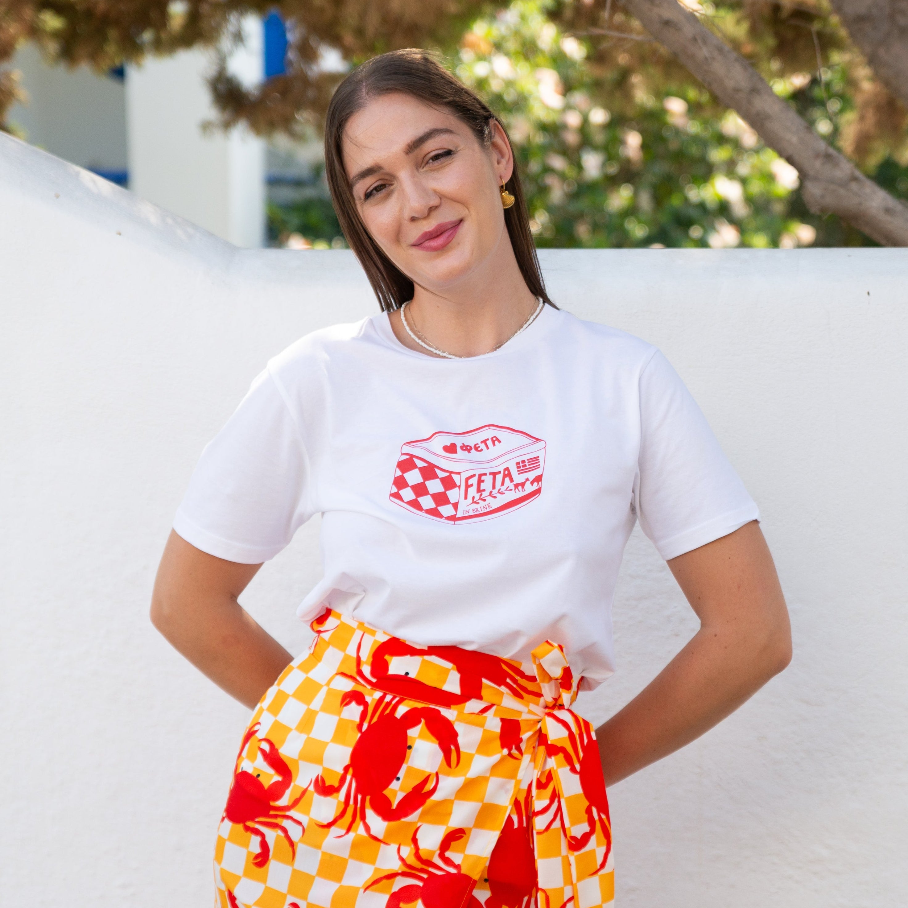 Silkscreen printed Love Feta T-shirt, printed in red ink on a white tee.
