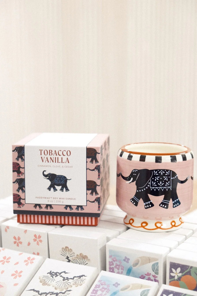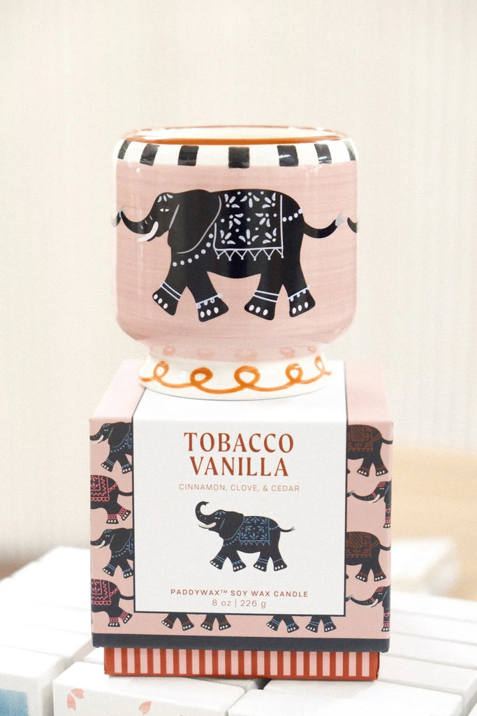 This hand-painted ceramic vessel, graced with an elegant elephant motif, offers more than light—it evokes a journey. Encased inside are warm, layered aromas: bright citrus and cinnamon top notes, followed by a heart of tobacco flower, patchouli and clove, and settling into a base of cedar, vanilla, sandalwood and amber.