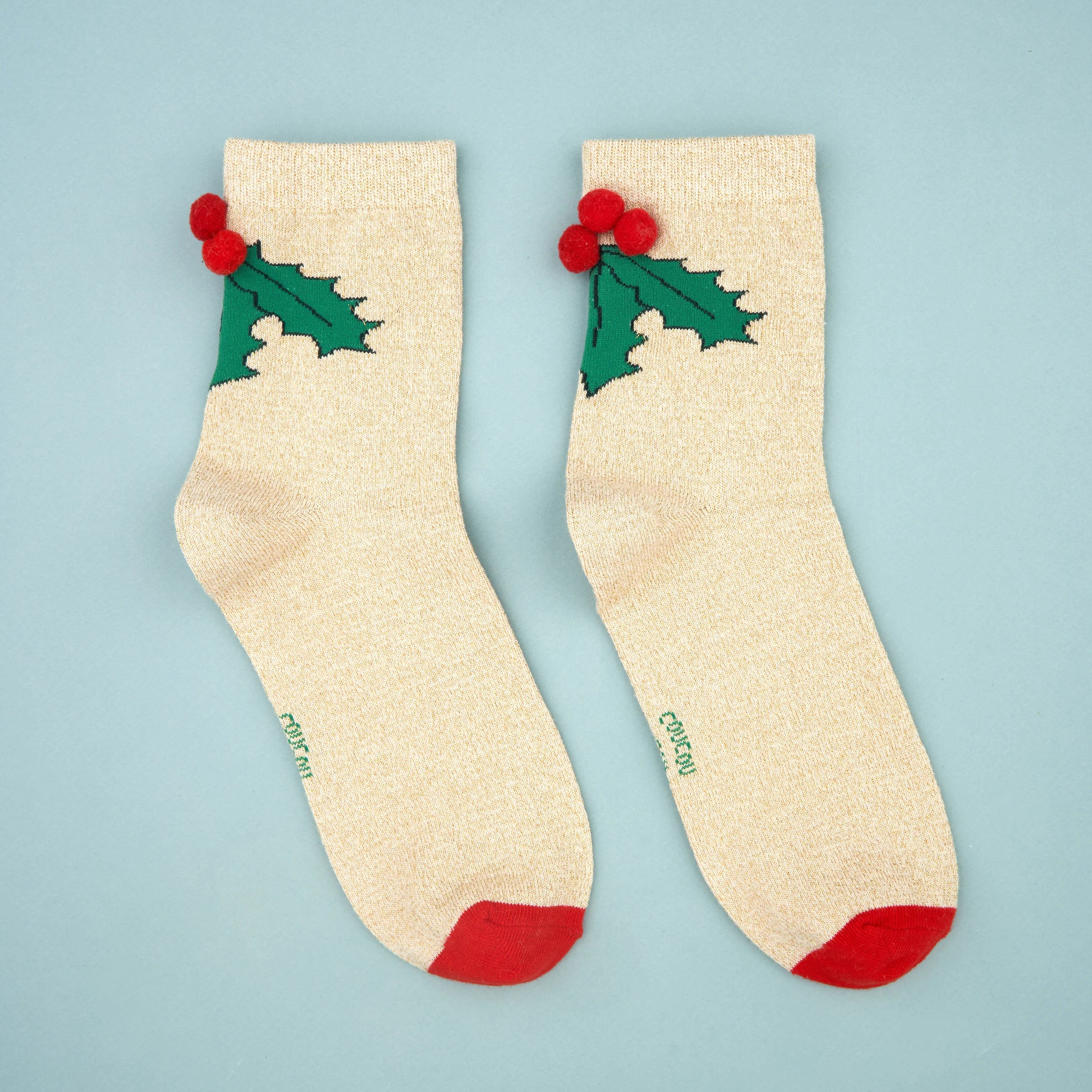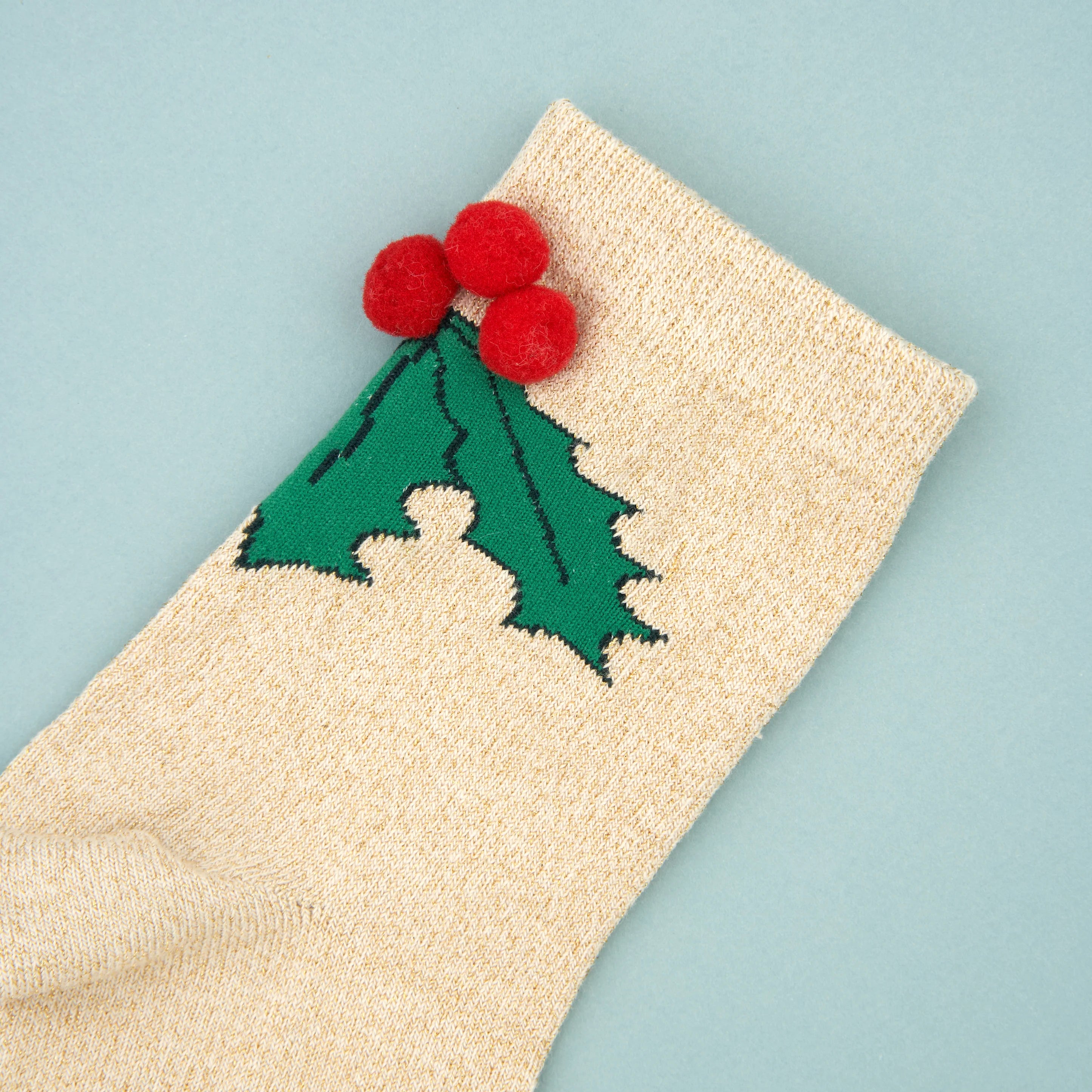 Add a touch of Christmas magic to your feet with these cream-colored glitter socks, featuring a holly motif just above the ankle and playful pom-poms! Wear them peeking out of your shoes to spread festive cheer wherever you go.
