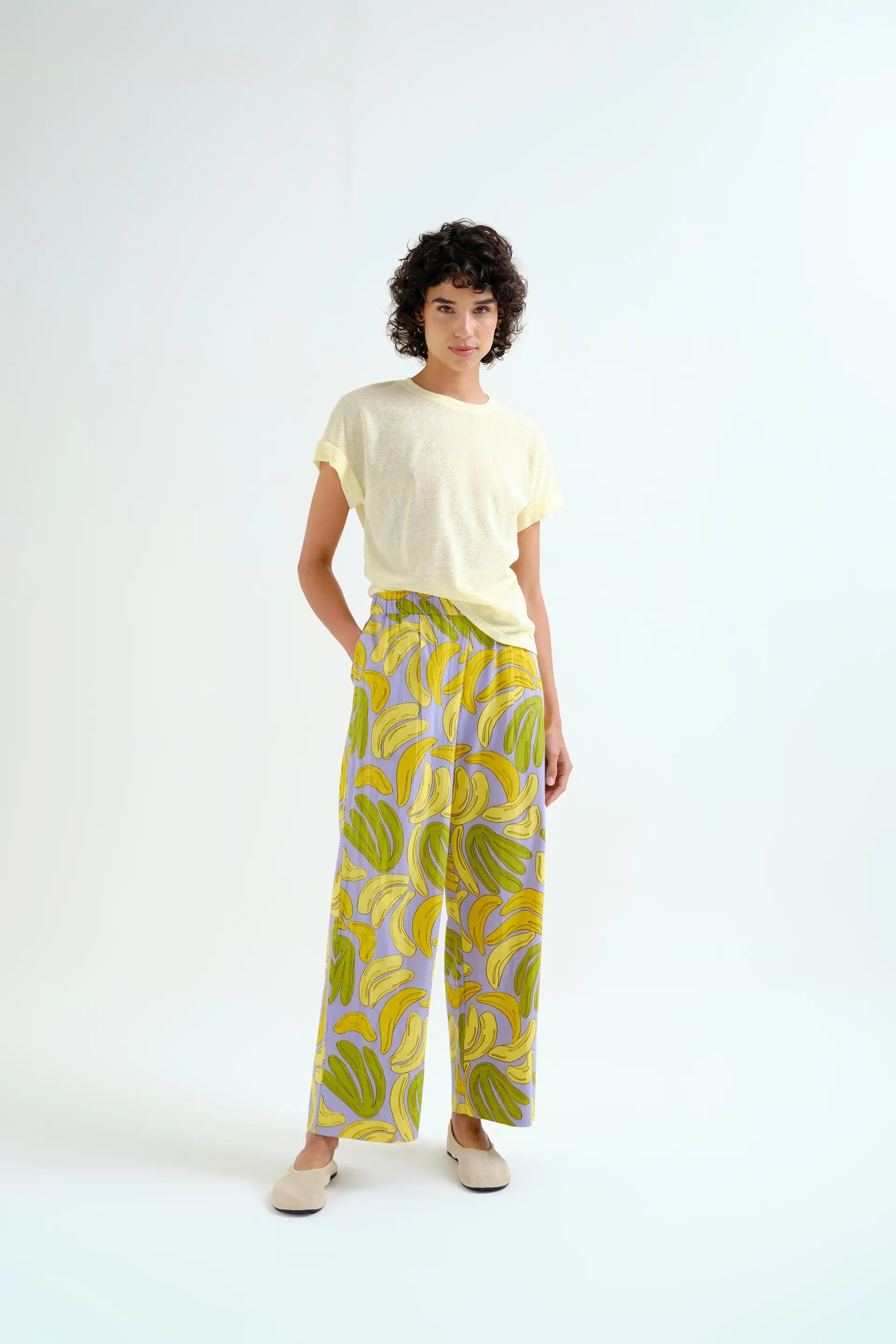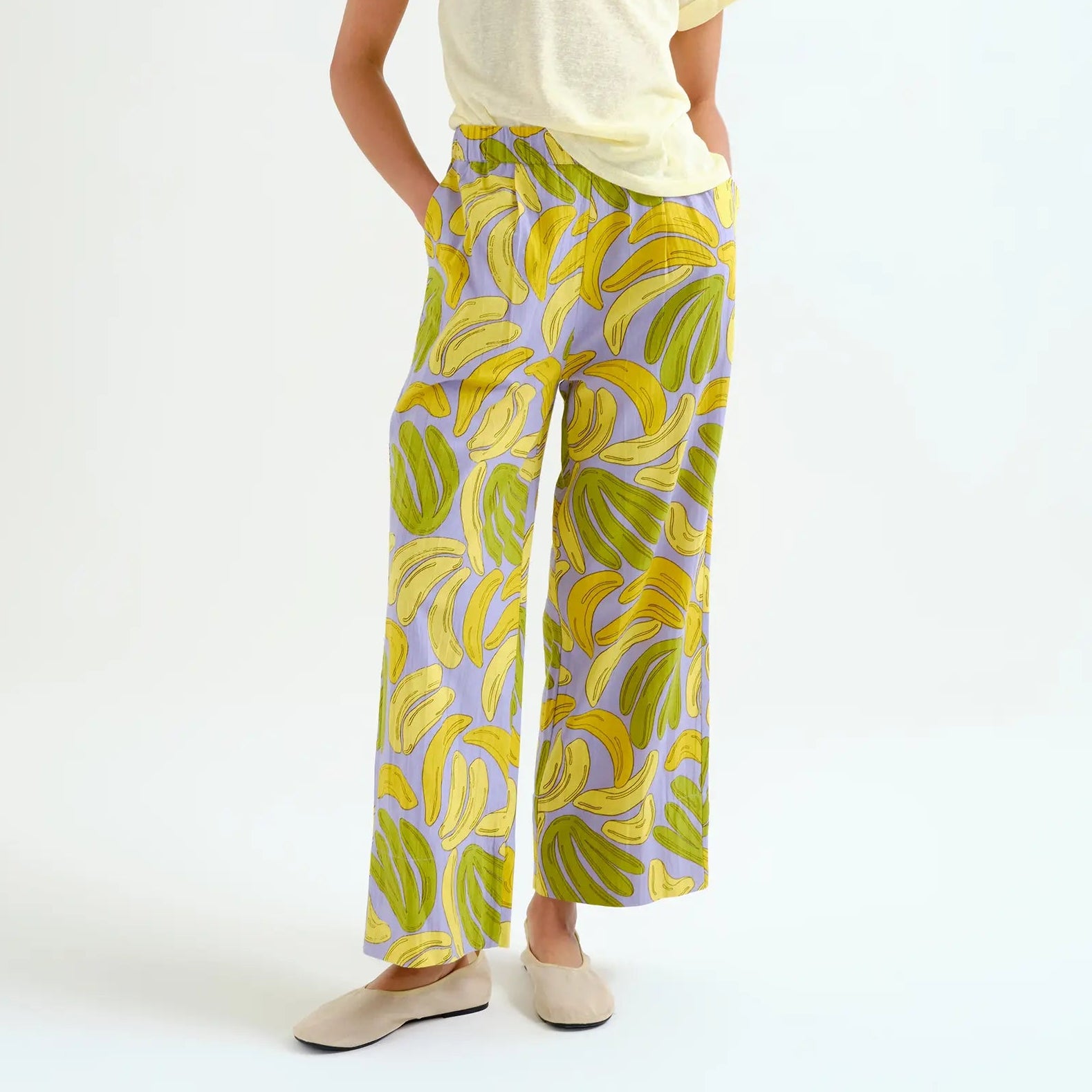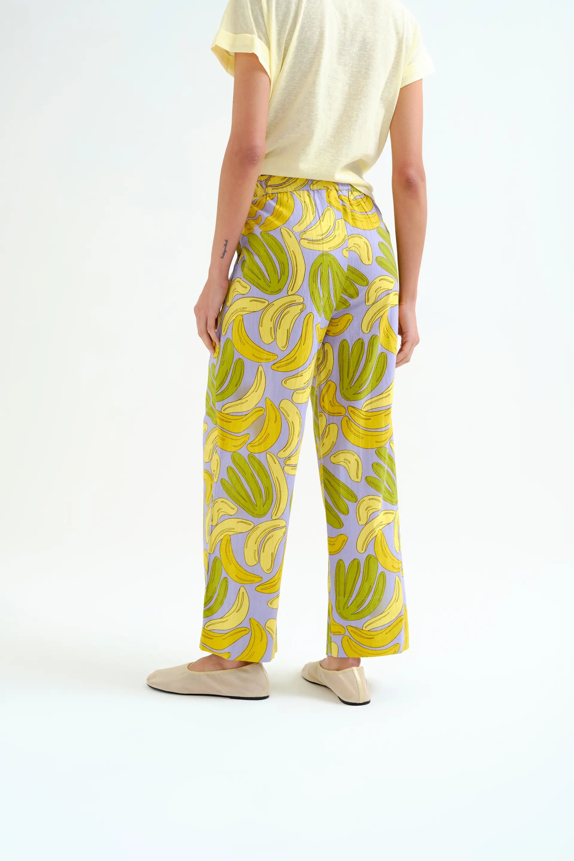 Featuring a vibrant banana print, a mid-rise elasticated waistband, and a straight-leg silhouette, these pants combine practicality with a fun, summery twist.