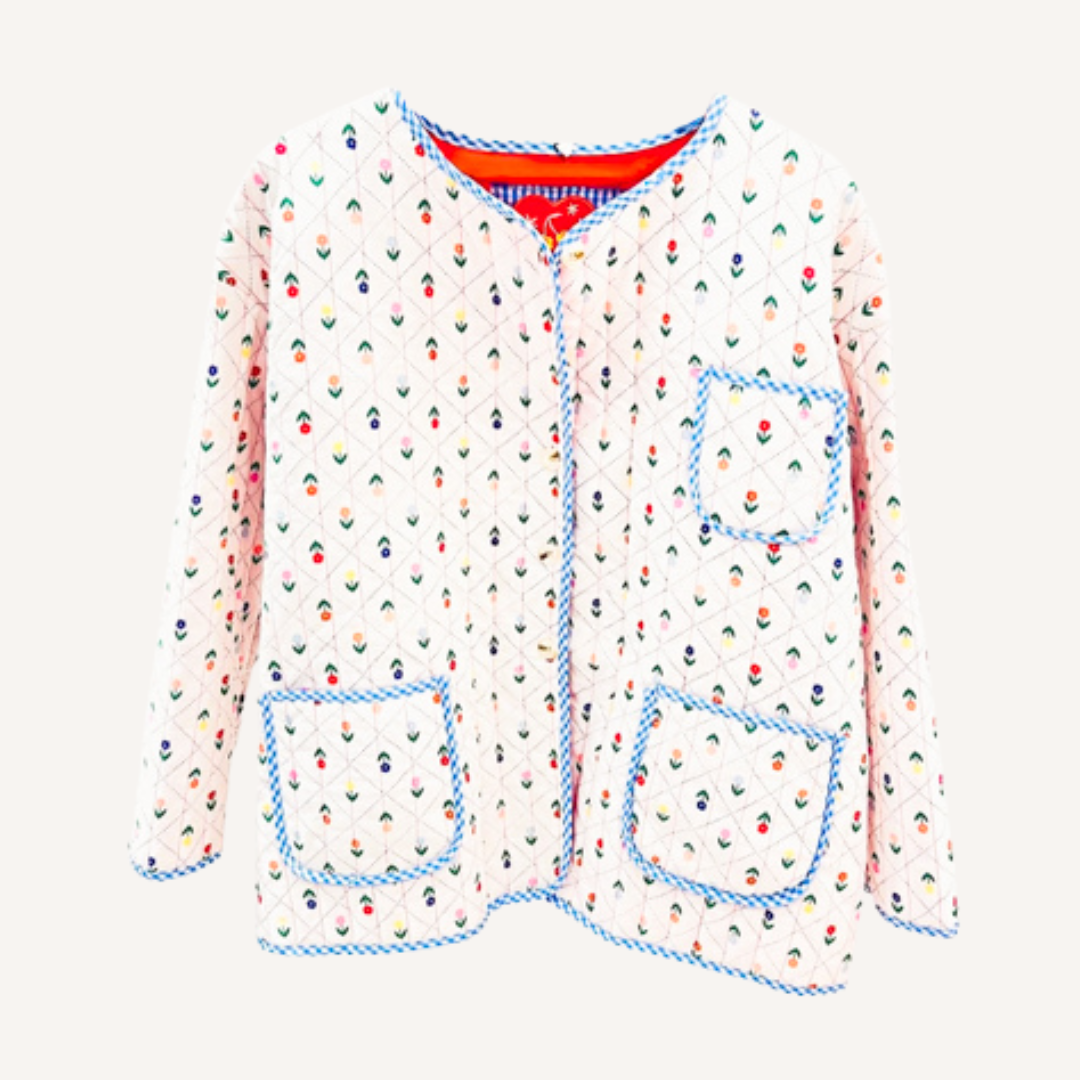 A lightweight quilted jacket featuring a delicate floral pattern that adds a playful yet elegant touch to everyday outfits. Designed with soft blue trim, contrasting red cuffs, and practical patch pockets, this piece combines comfort with a distinctive look. Perfect for layering during spring and mild weather.