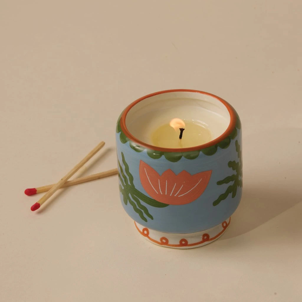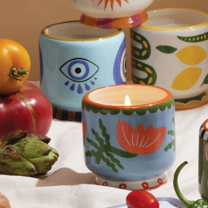 These 227 g ceramic candles, featuring whimsical hand-painted designs, are bursting with vibrant scents that bring their imaginative look to life and awaken your senses.