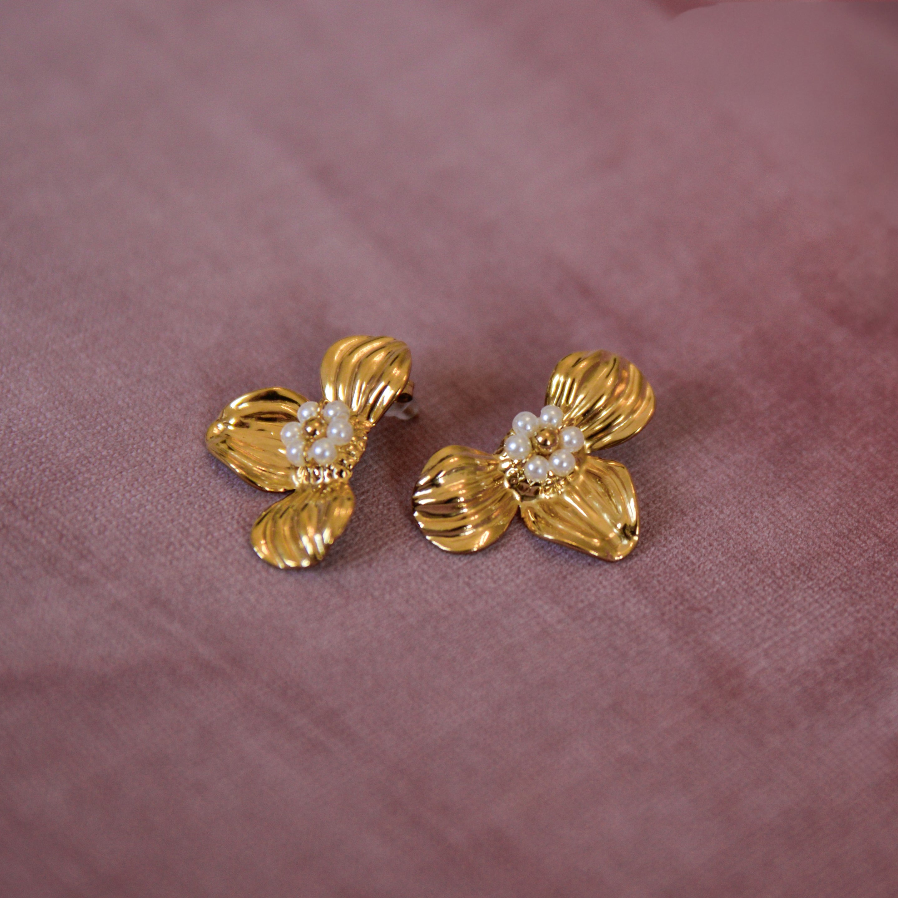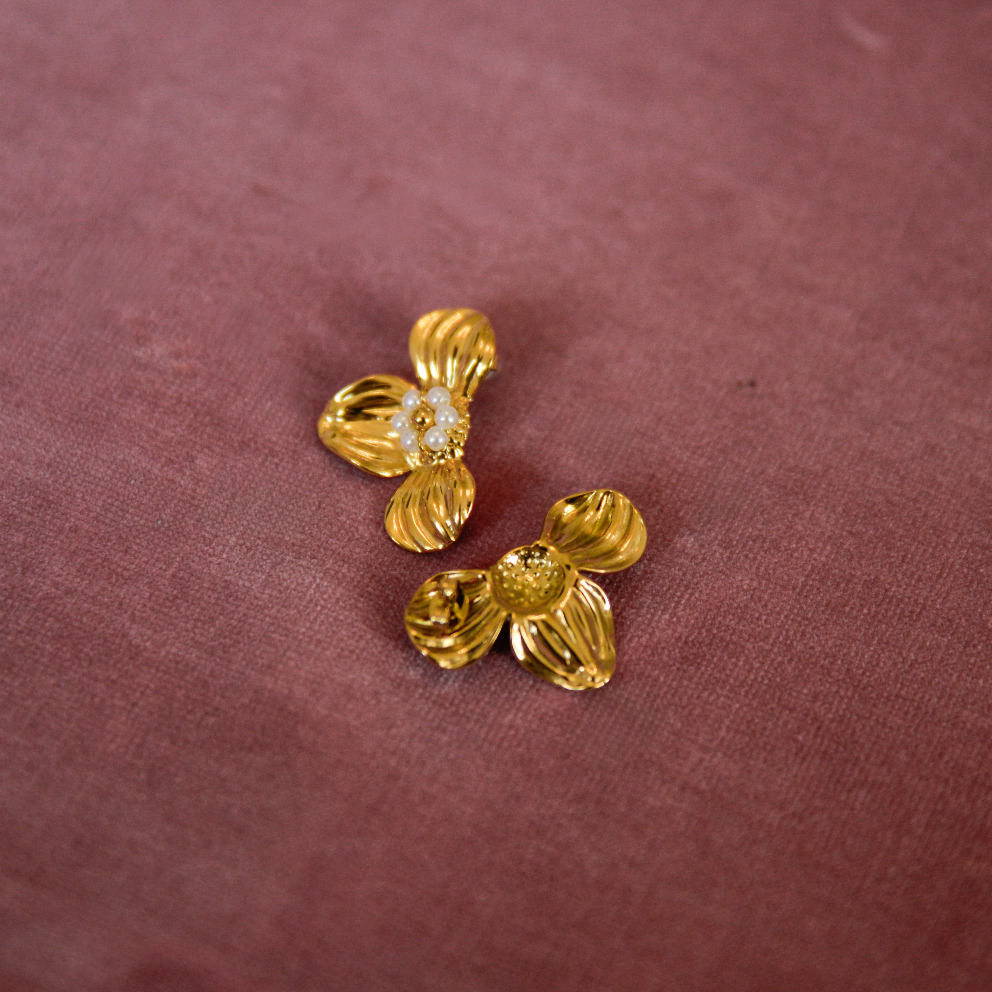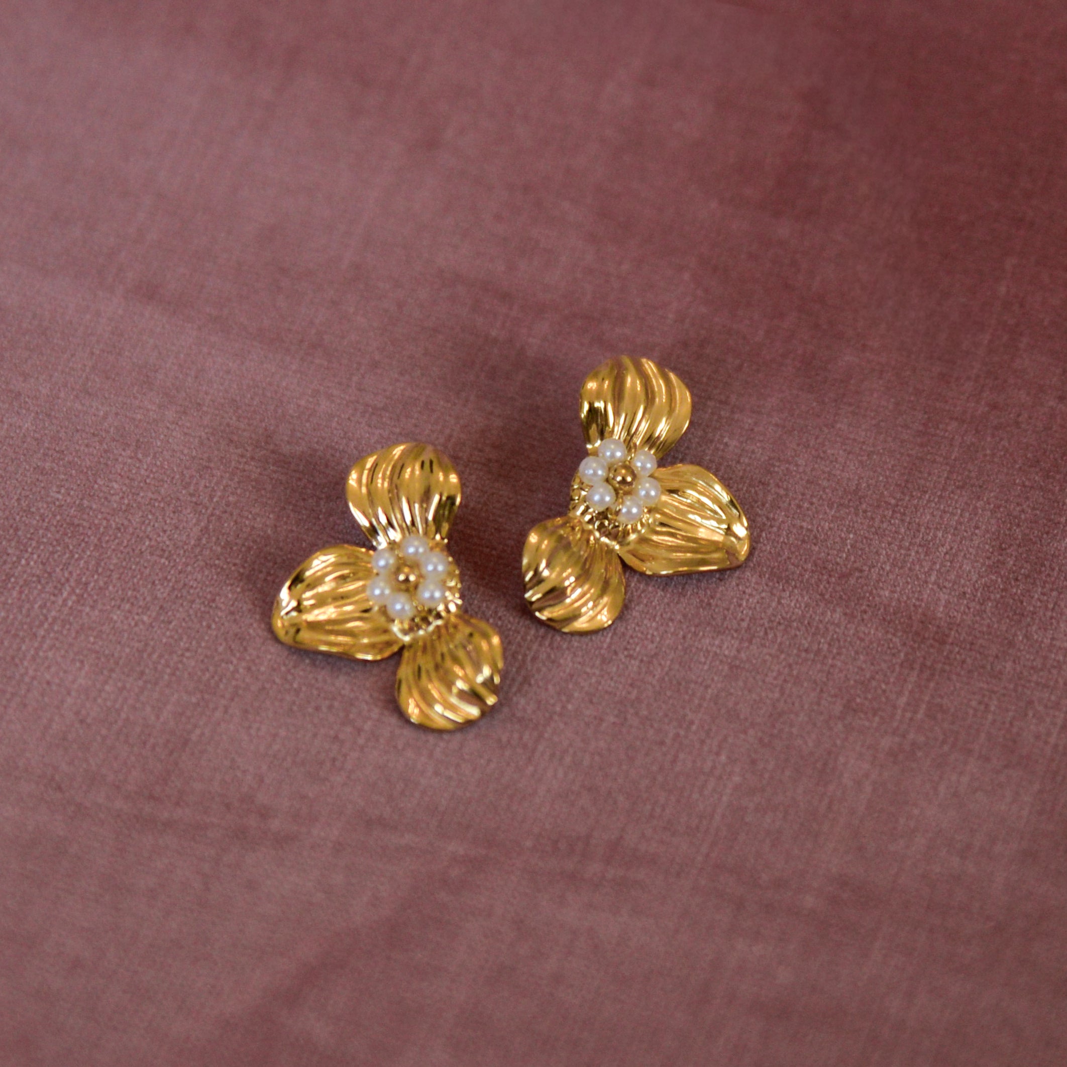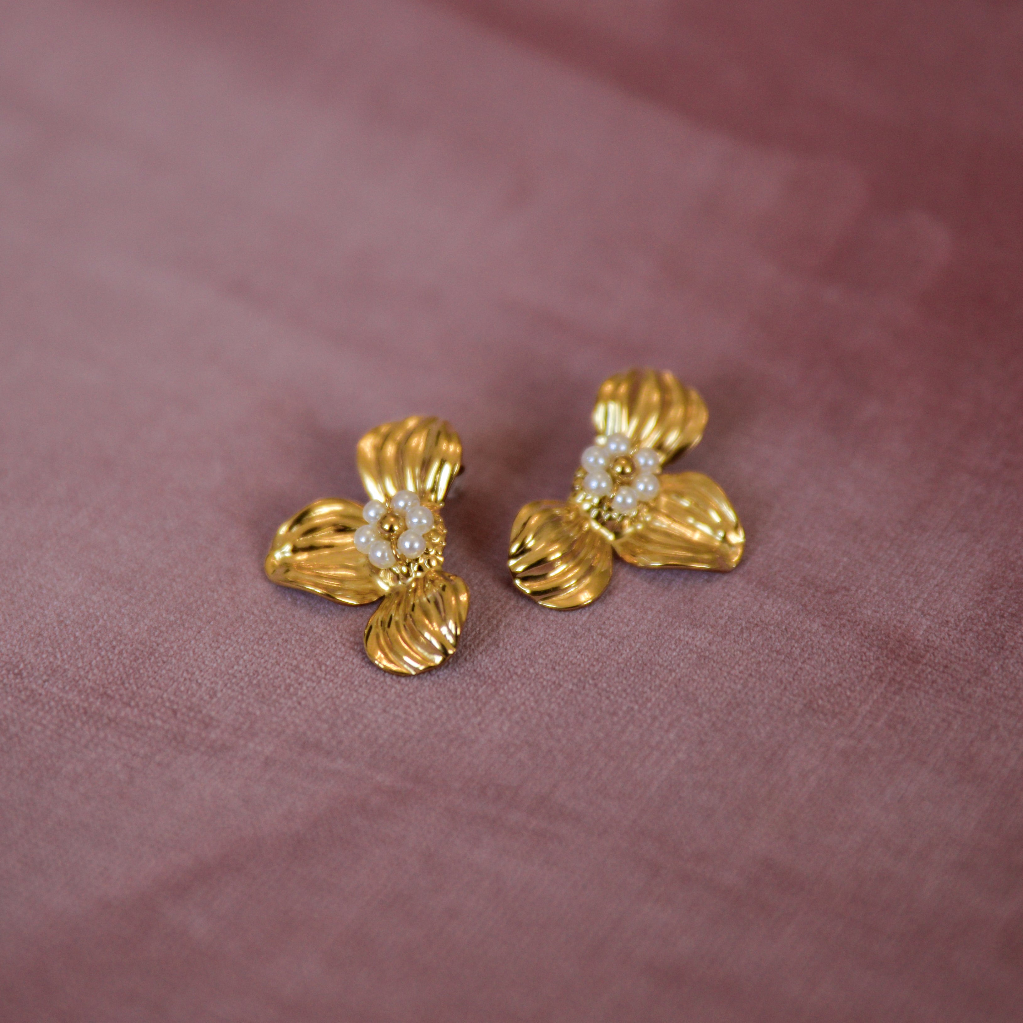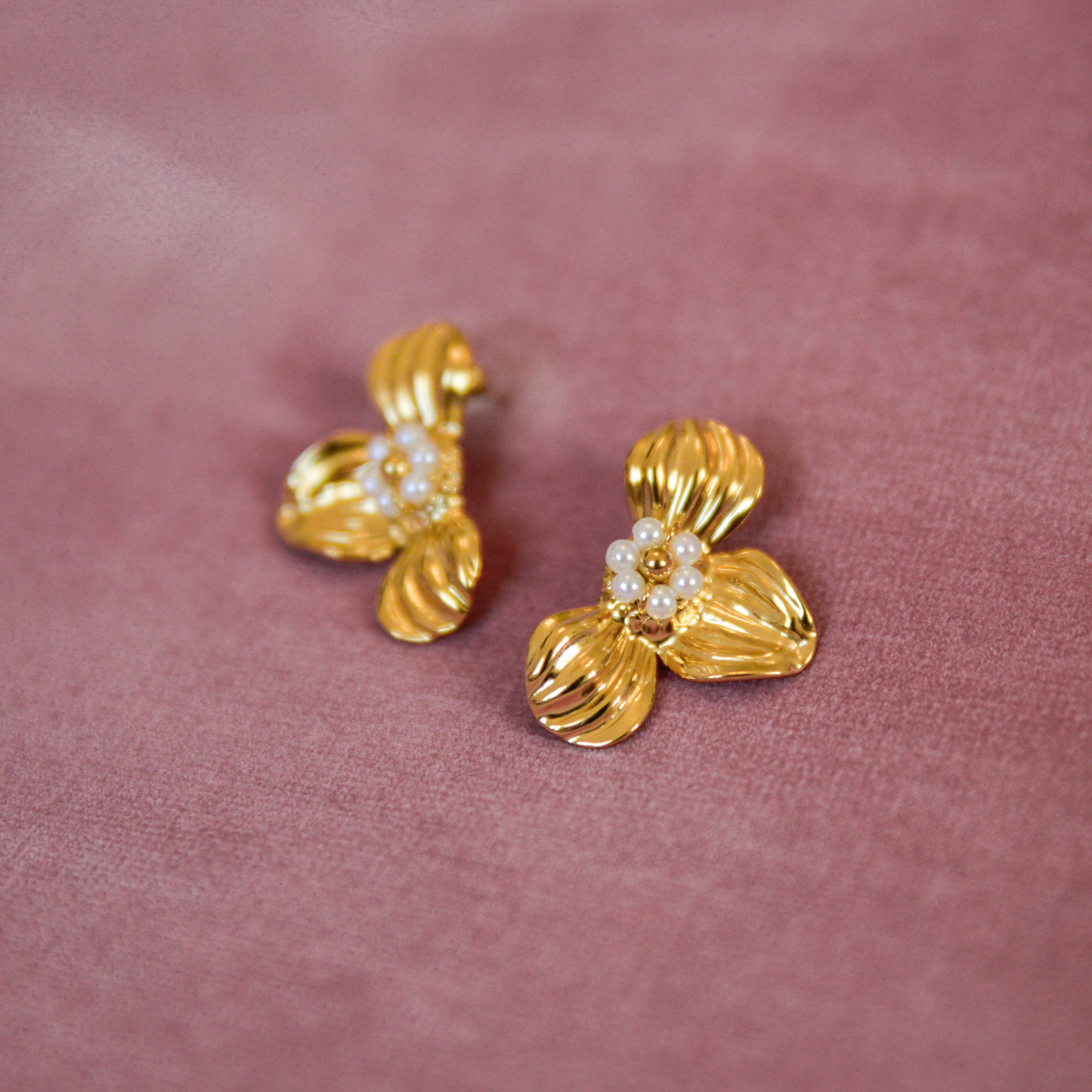 Elegant with a romantic twist, the Kylie Floral Earrings in Gold & White bring timeless charm to your jewelry collection. Featuring a sculpted three-petal floral design accented with delicate white acrylic beads at the center, these statement studs (22 mm x 30 mm) add soft dimension and luminous detail to any look.