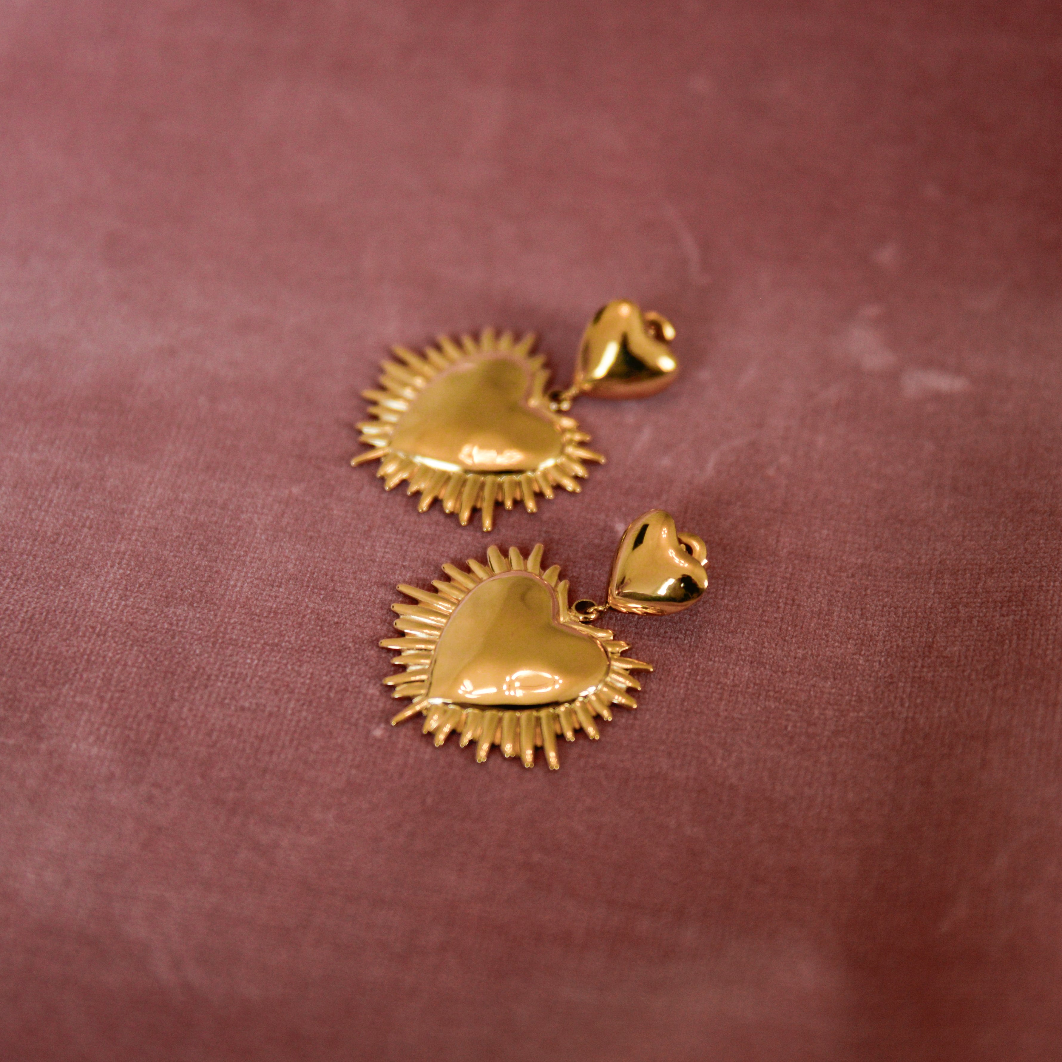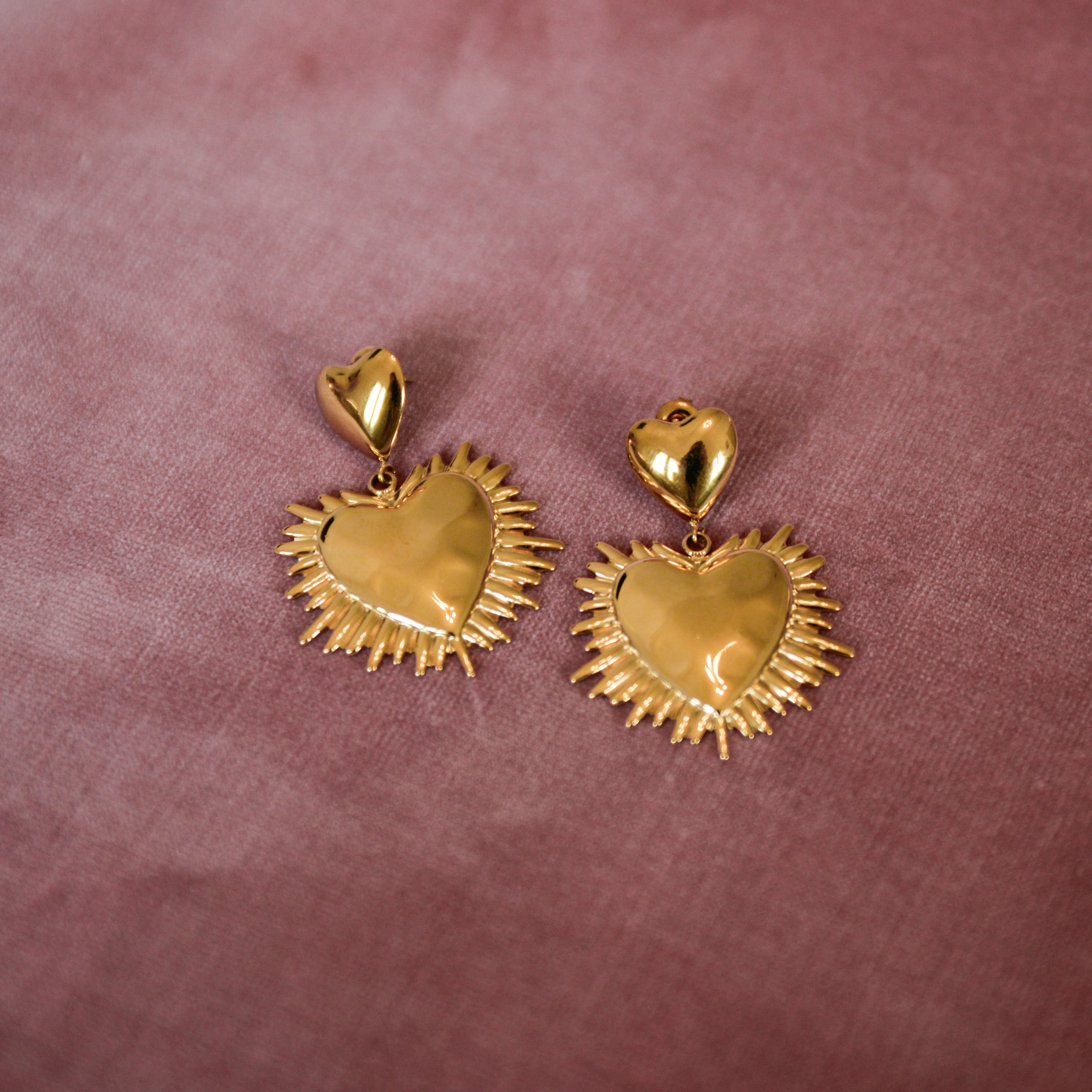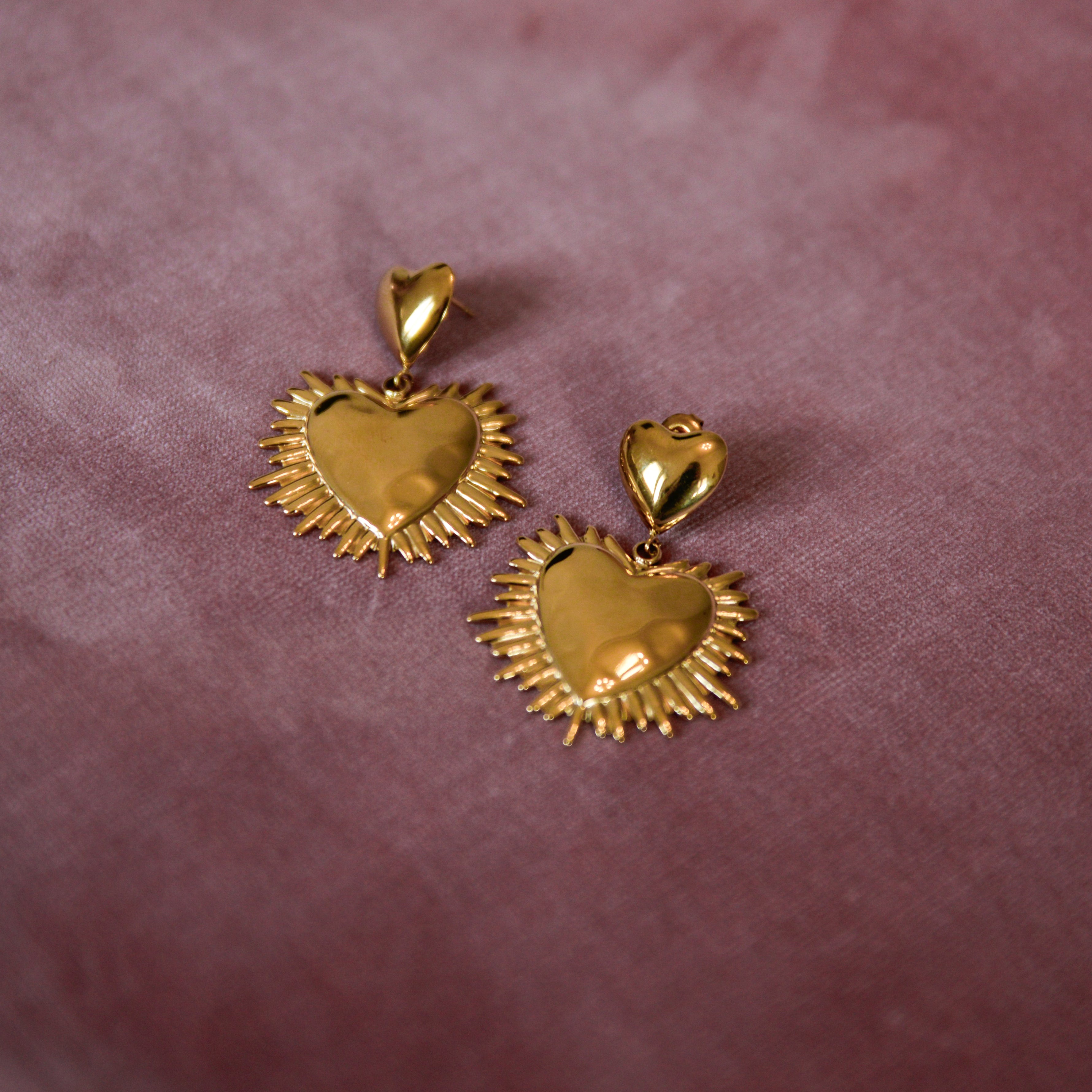 Romantic and luminous, Liora Earrings in Gold feature a double-heart design with a sculpted sunburst frame that catches the light beautifully. With their elegant 45 mm length, these statement dangle earrings bring movement, shine, and timeless charm to any look perfect for both everyday glow and special occasions.