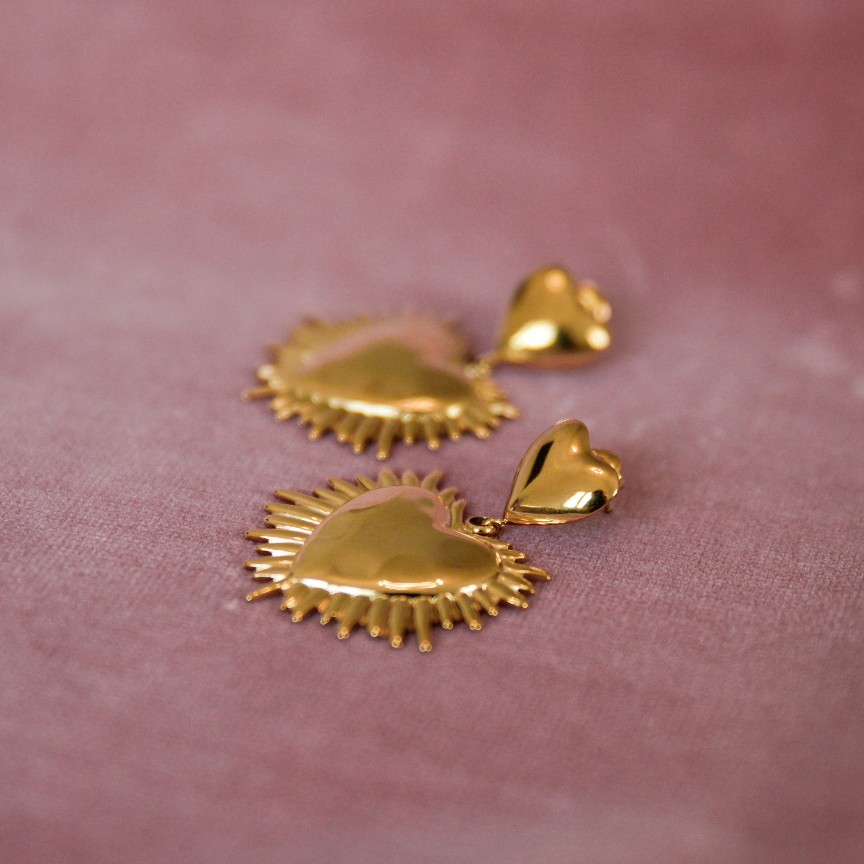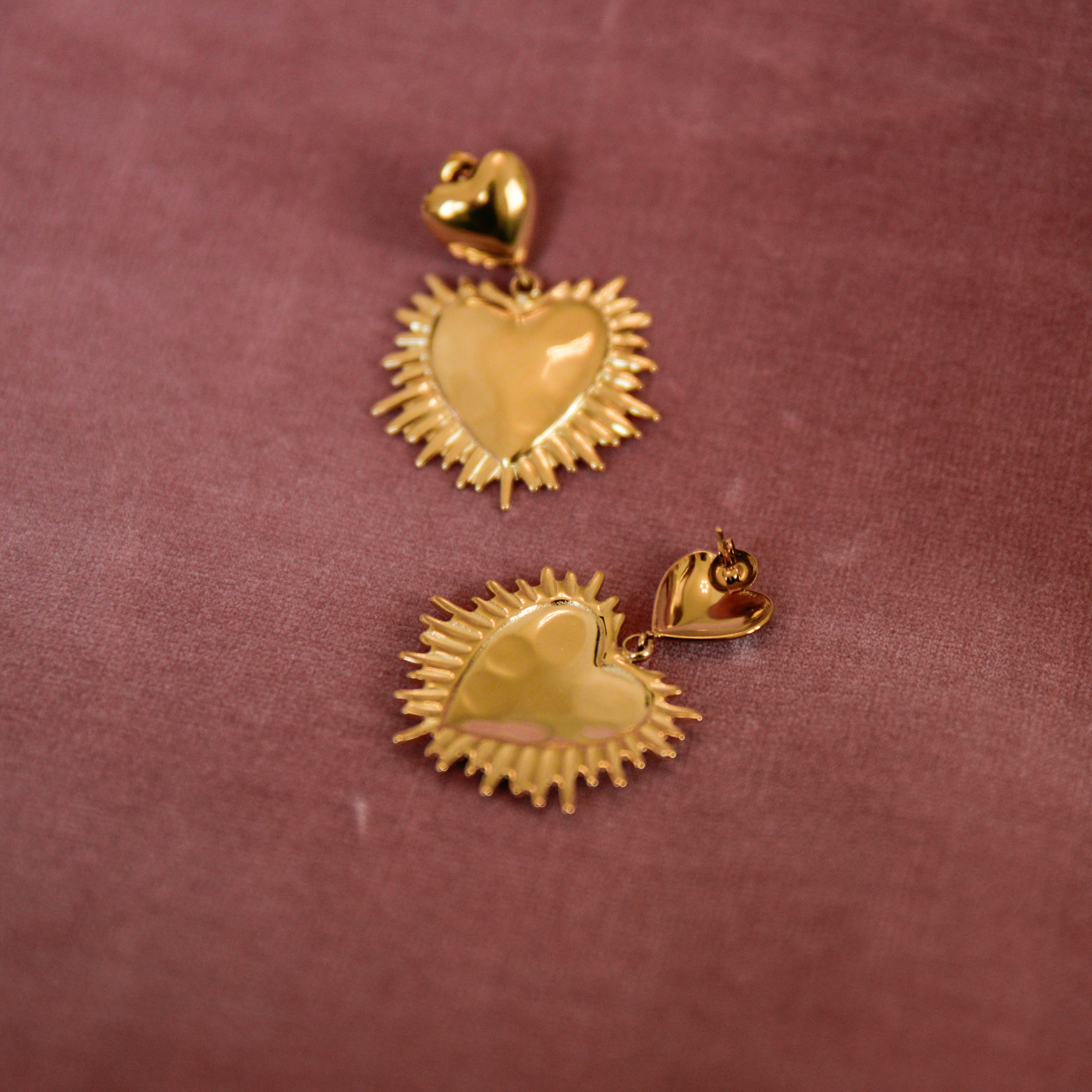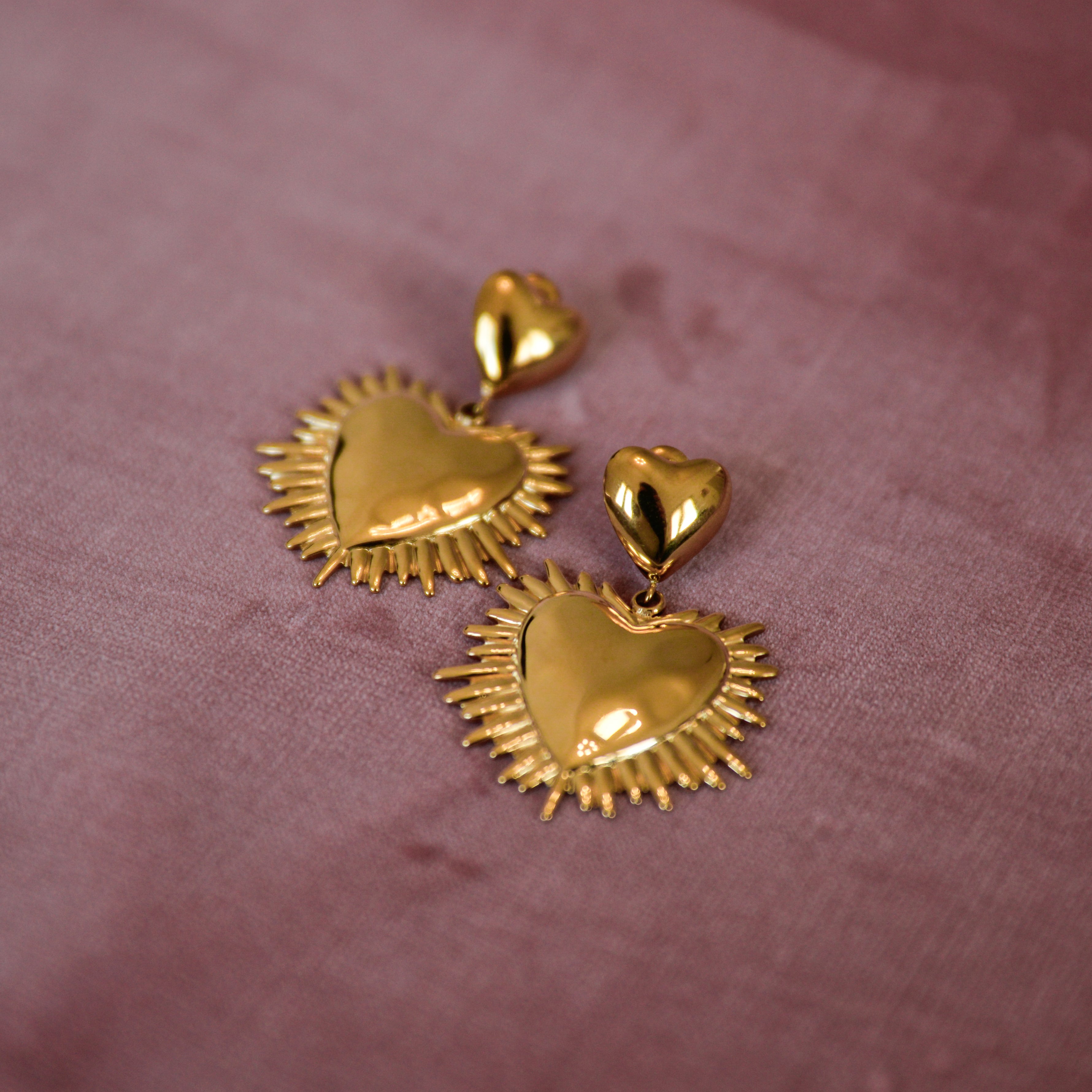 Romantic and luminous, Liora Earrings in Gold feature a double-heart design with a sculpted sunburst frame that catches the light beautifully. With their elegant 45 mm length, these statement dangle earrings bring movement, shine, and timeless charm to any look perfect for both everyday glow and special occasions.