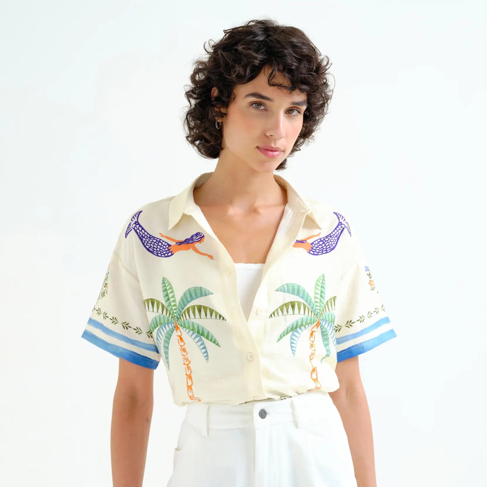 Featuring a palm and mermaid print, a notched collar, and slightly dropped shoulders, this shirt blends relaxed tailoring with a whimsical twist. The white button-front closure adds a clean, classic finish.