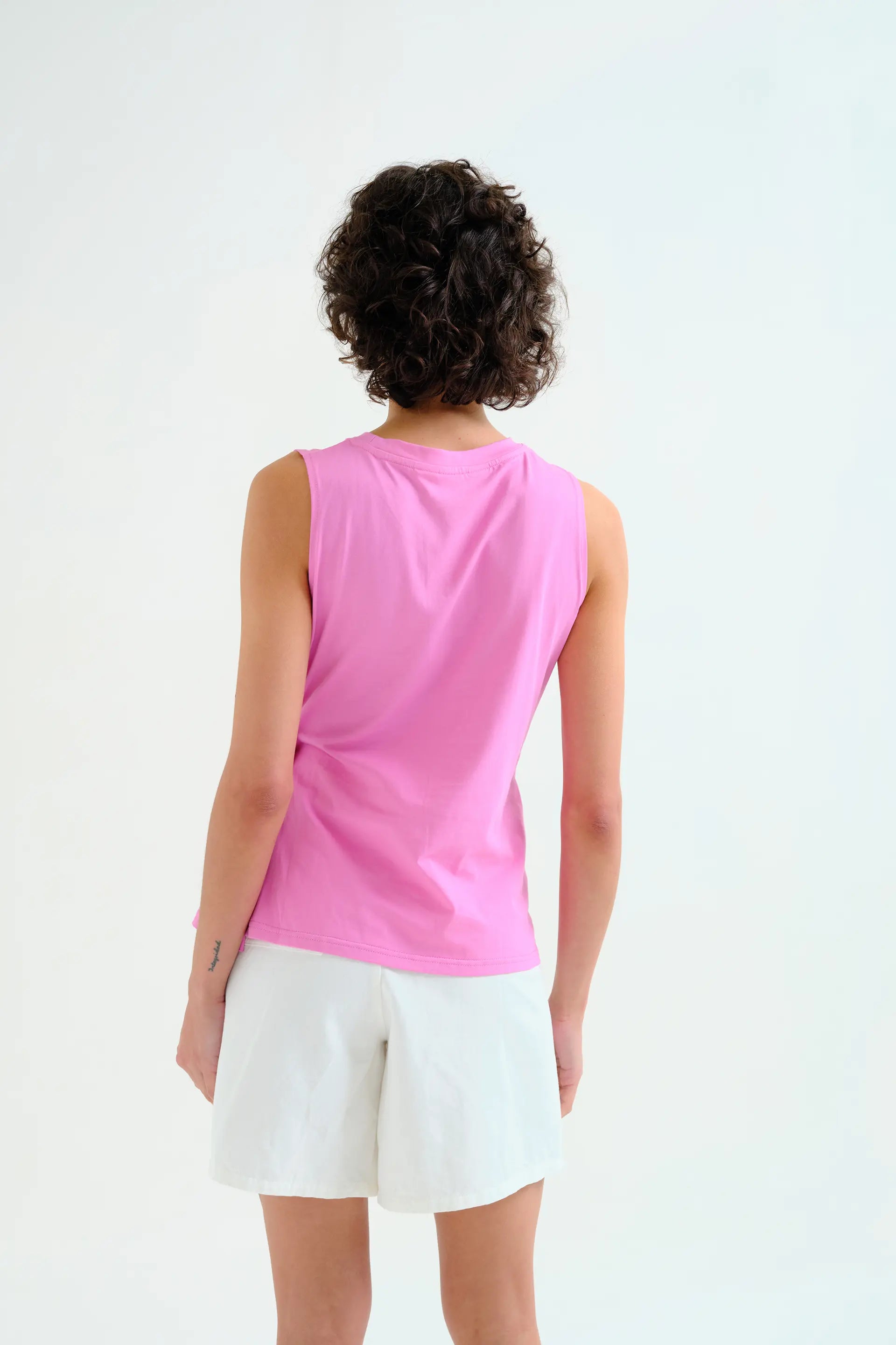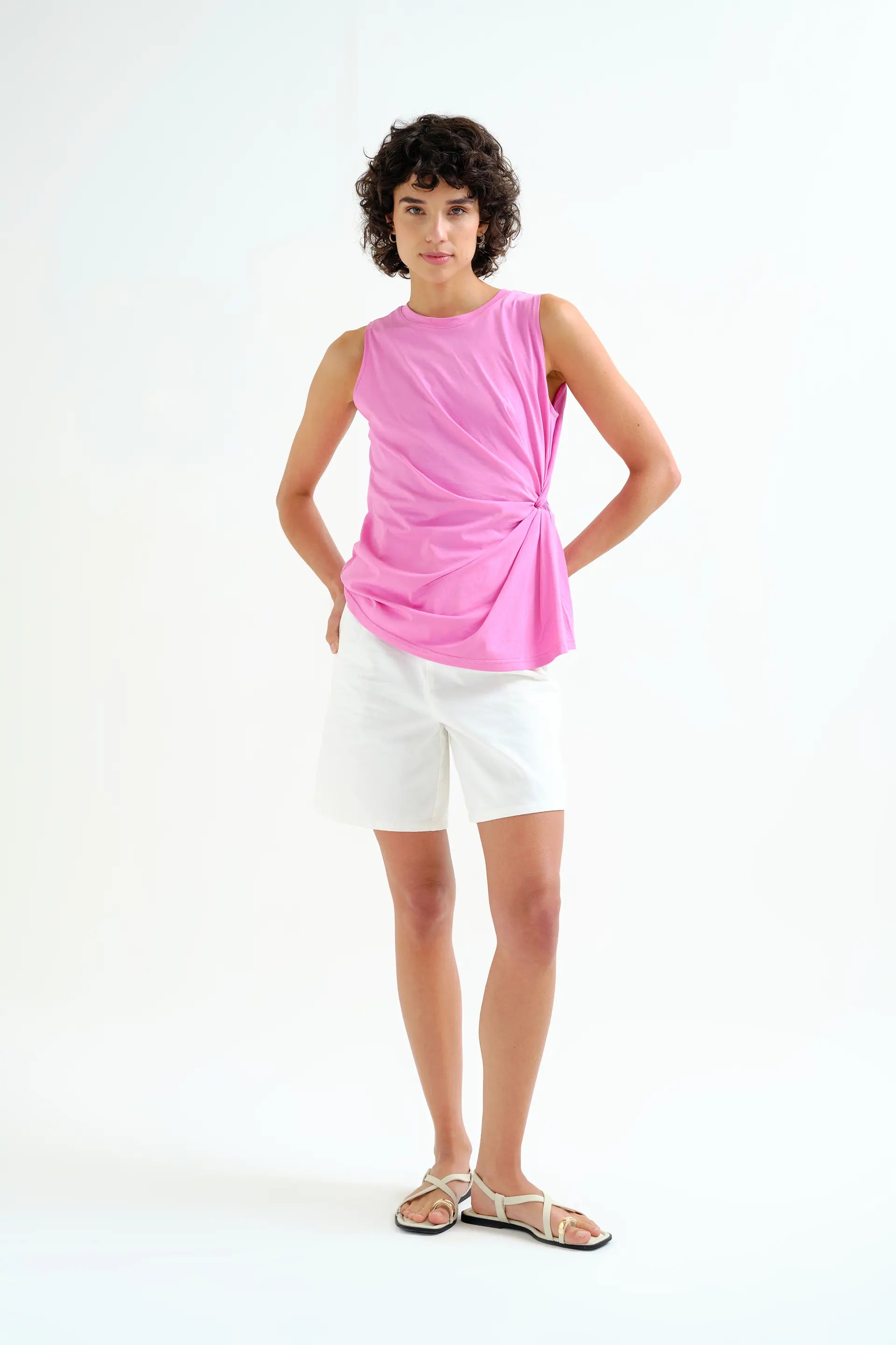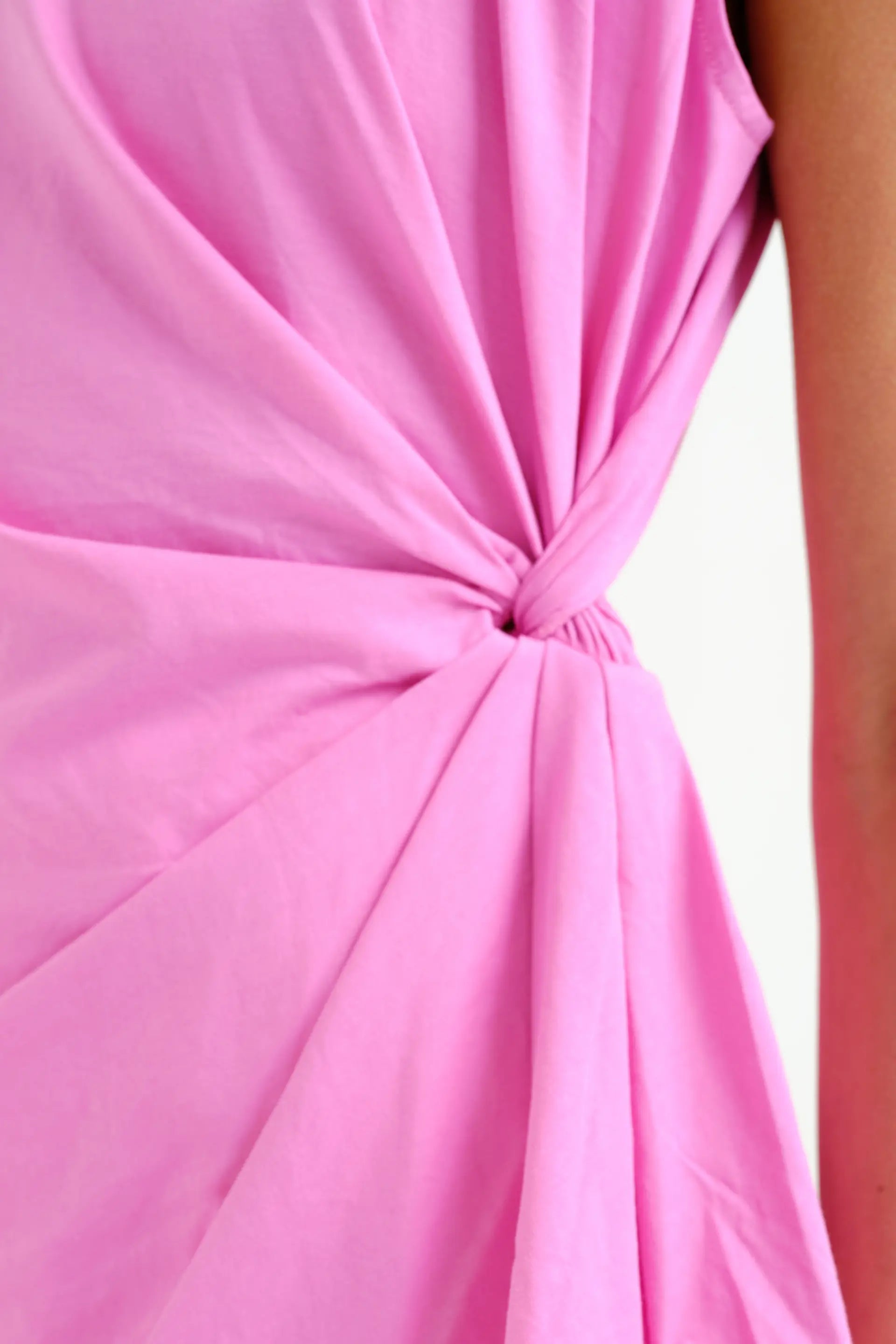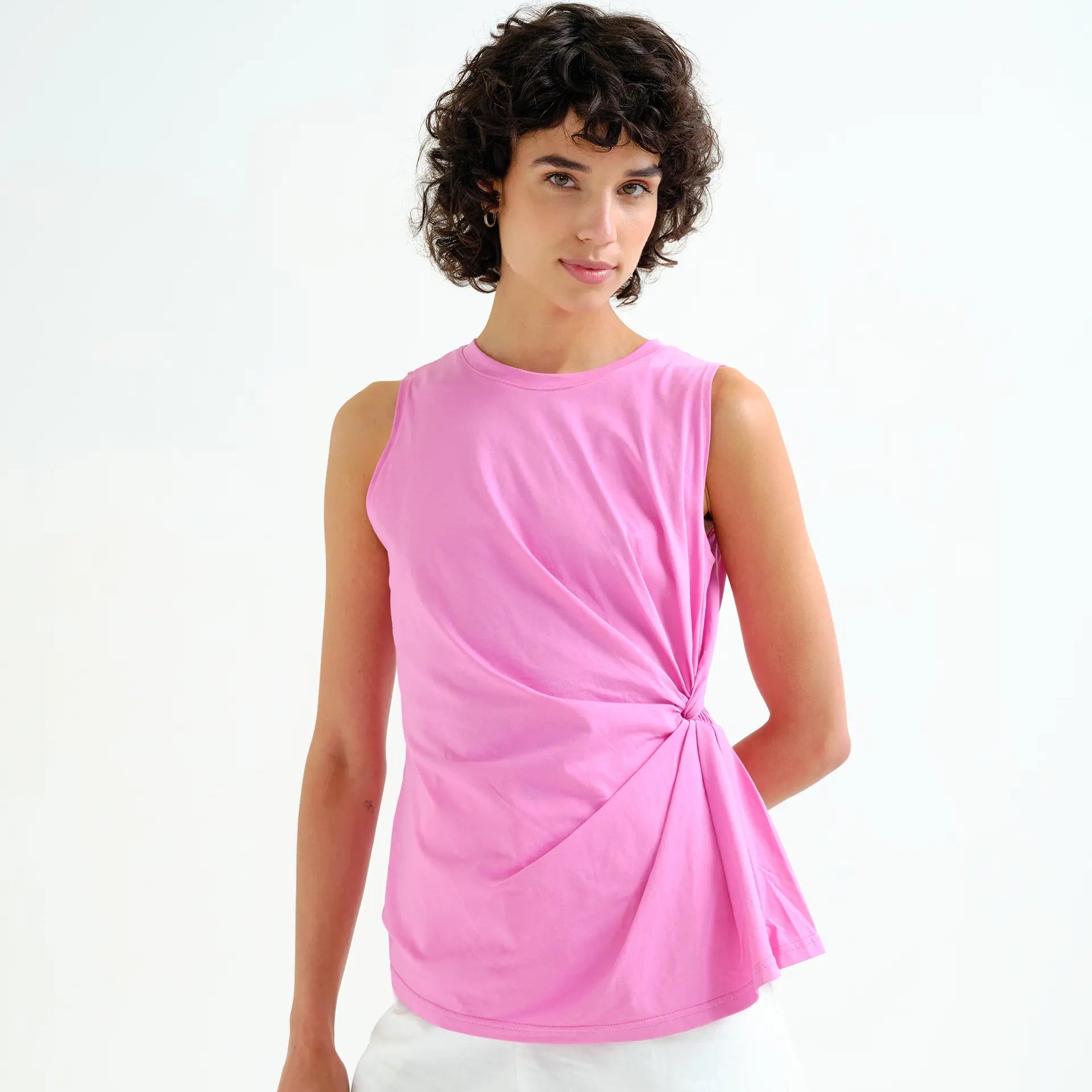 Featuring a clean round neckline and a sleeveless silhouette, this piece is enhanced by a delicate side drape that adds movement and a flattering touch to the design. The soft pink hue brings a fresh, romantic feel, perfect for effortless styling.