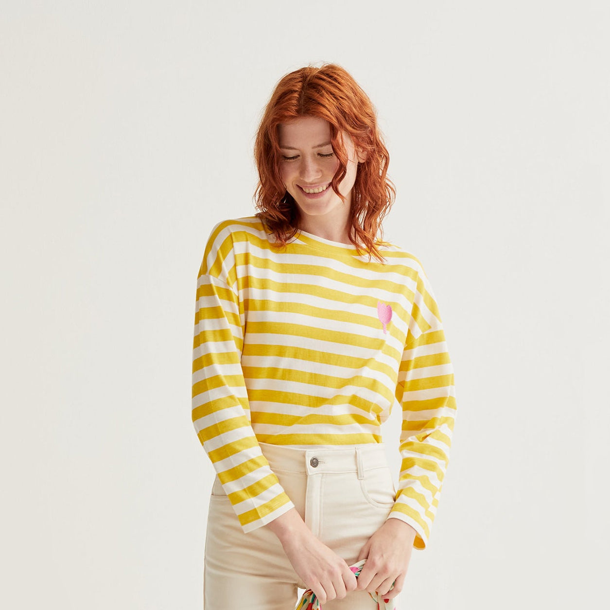 Bright and effortlessly cheerful, this striped long sleeve T-shirt brings a playful touch to everyday dressing. Featuring bold yellow and white stripes with a subtle tulip detail on the chest, it blends classic style with a fun, artistic twist. Made from soft cotton for all-day comfort, the relaxed silhouette and round neckline make it easy to style with jeans, skirts, or tailored trousers for a fresh and casual look.