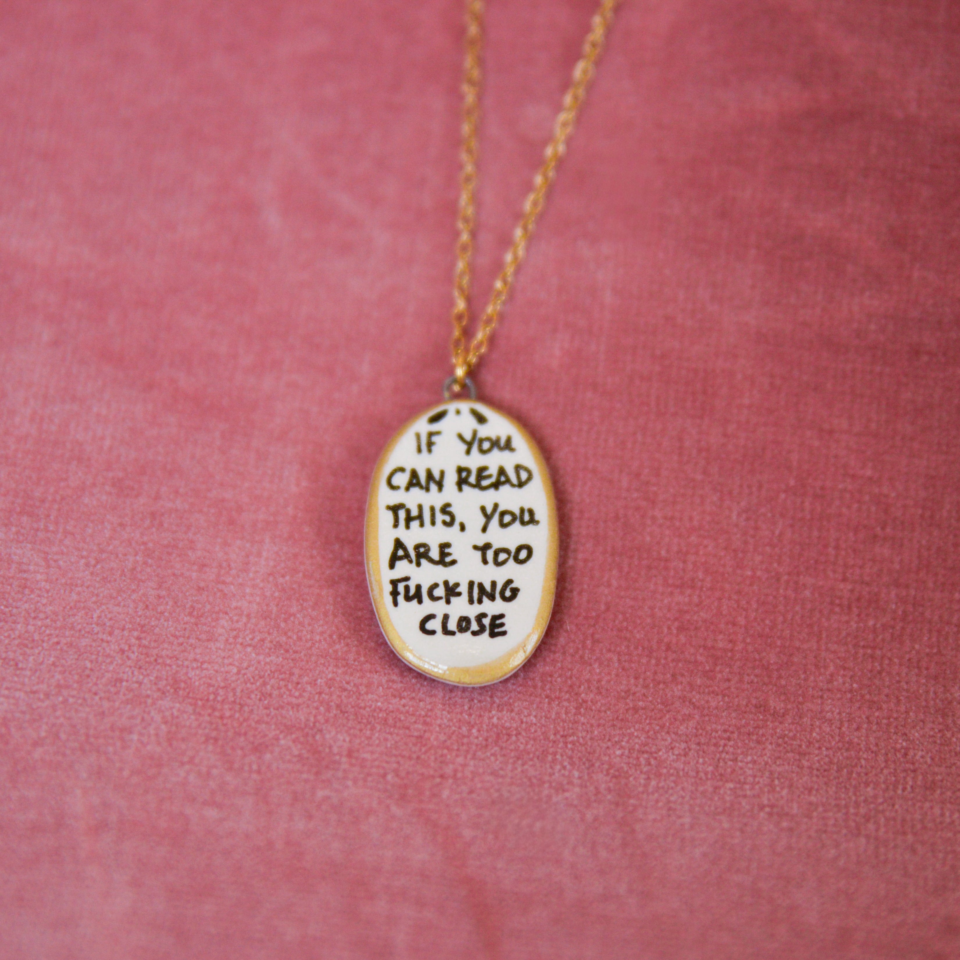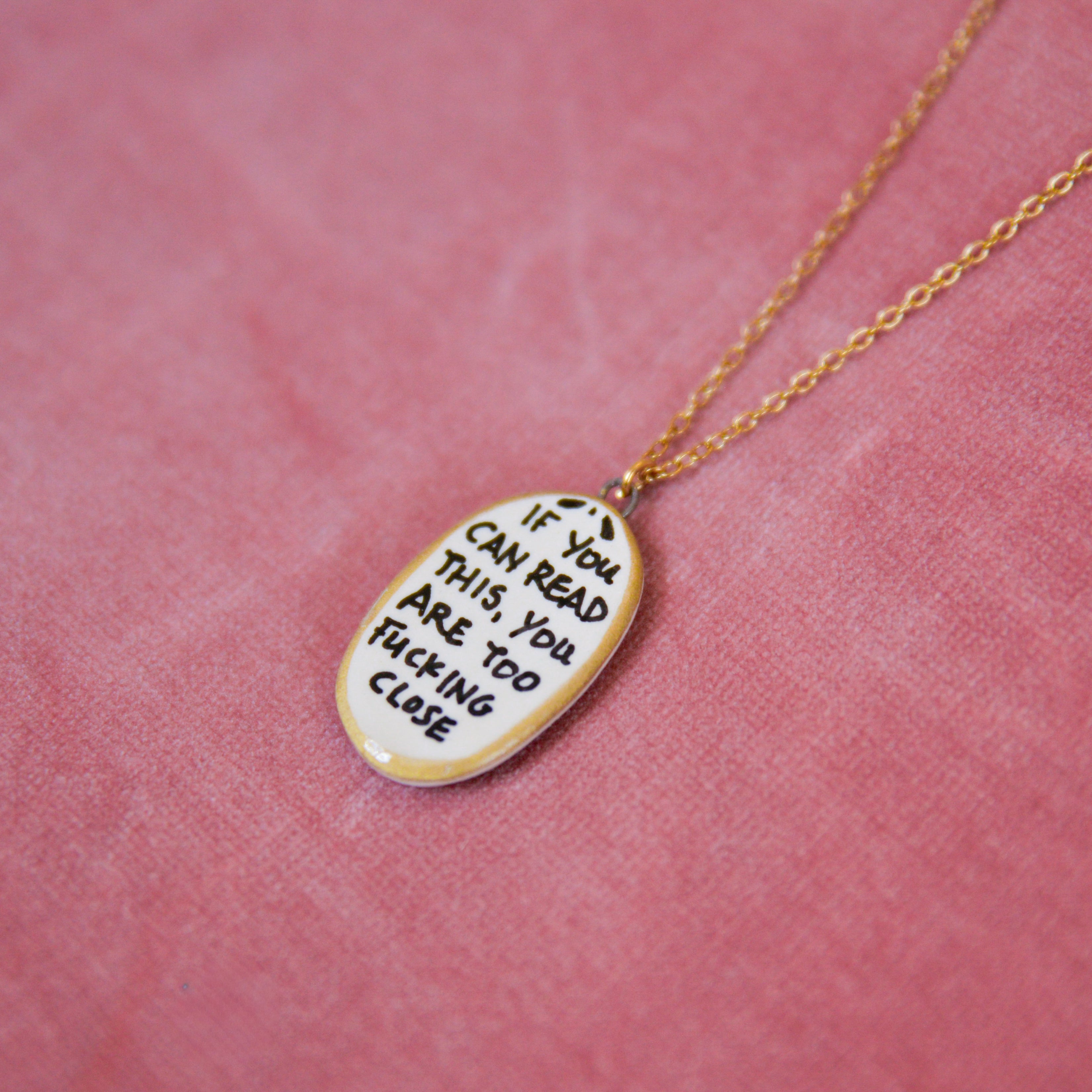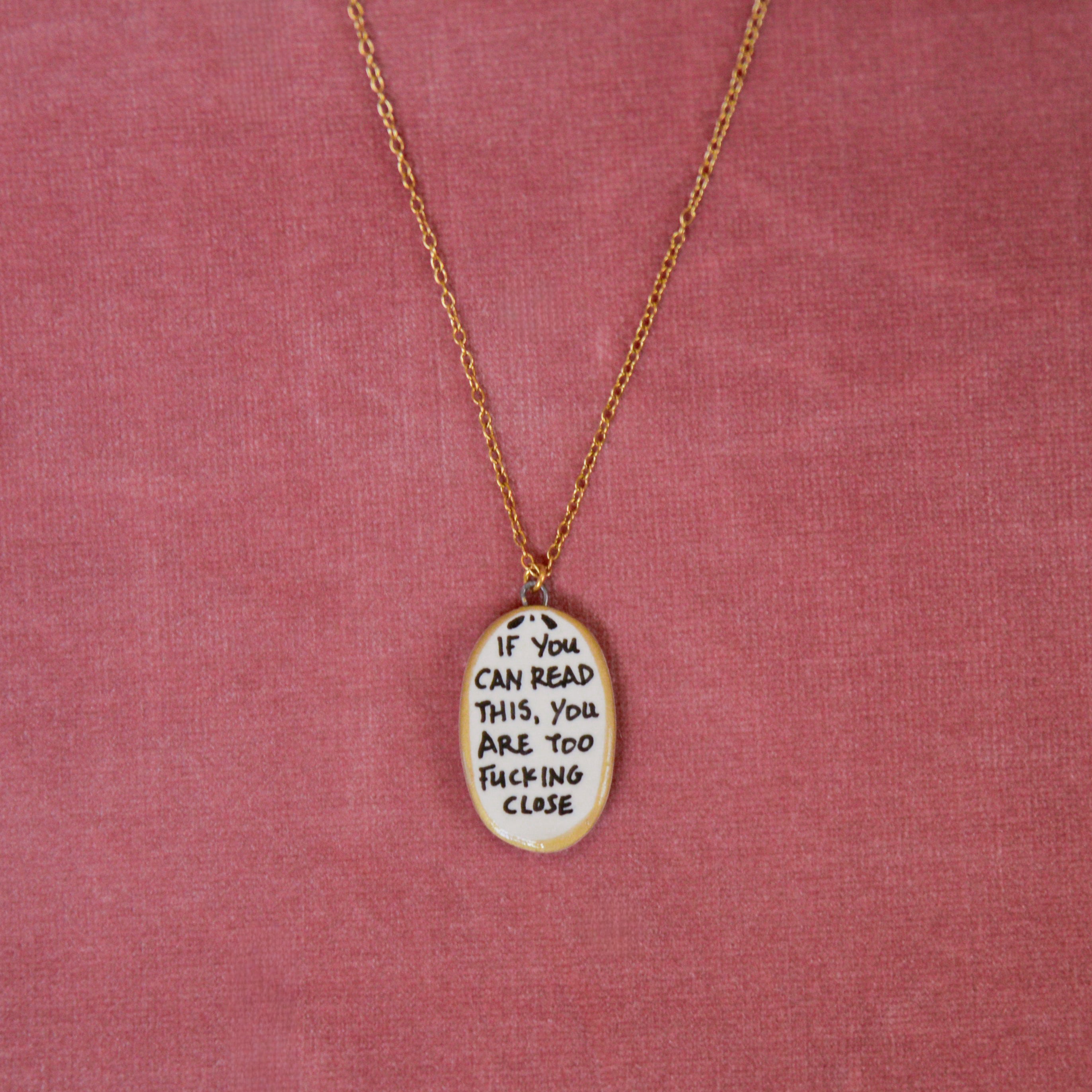 Bold, cheeky, and impossible to ignore. The Too Close Necklace features a hand-painted ceramic pendant with a statement phrase that says exactly what you’re thinking.