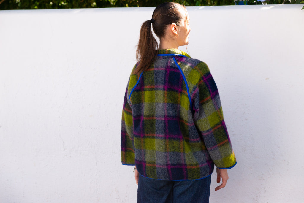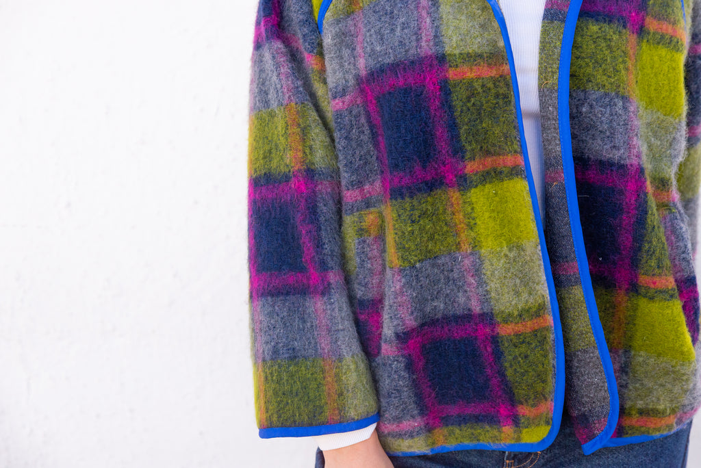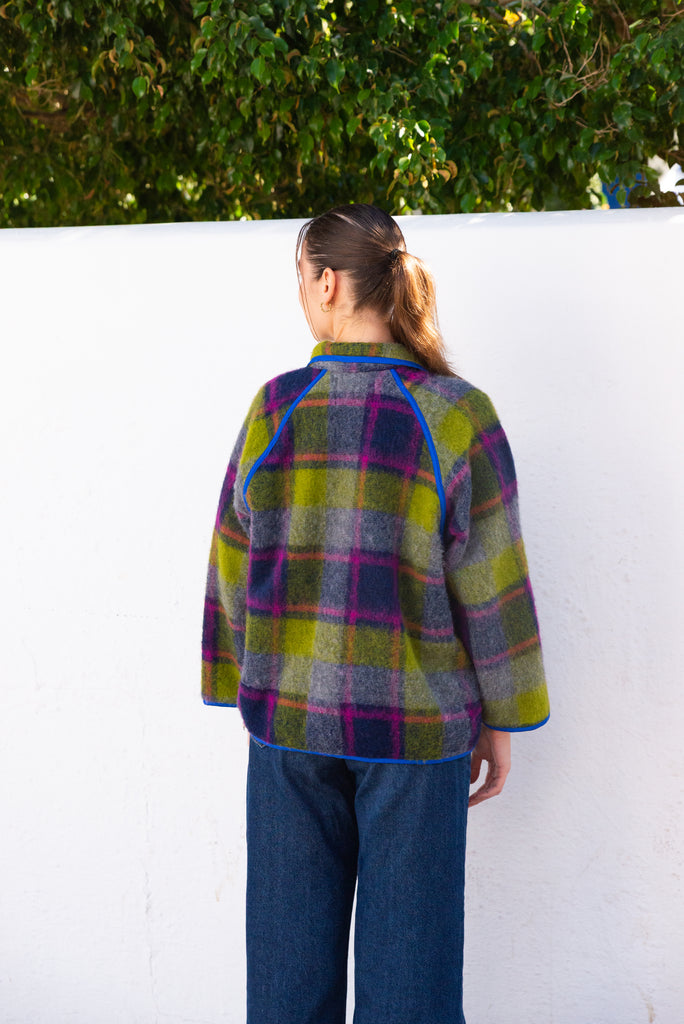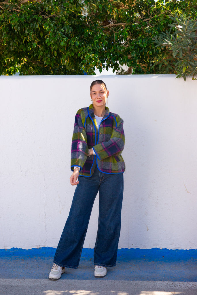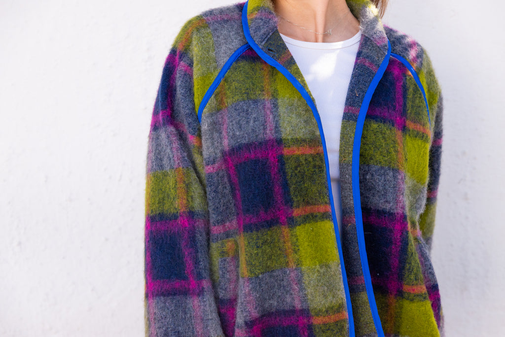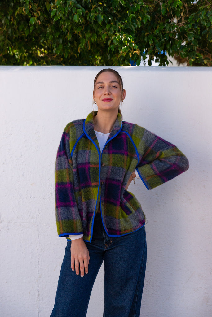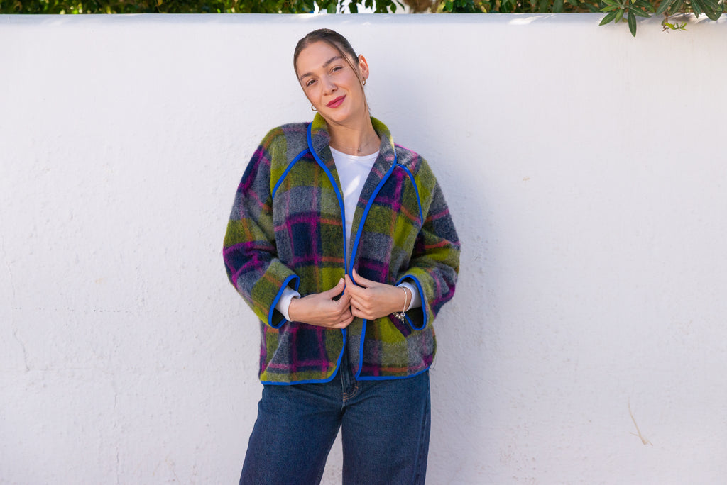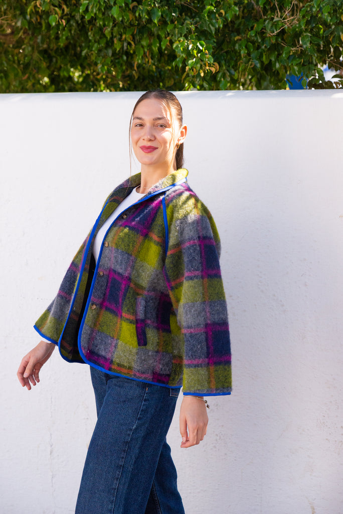 Viola Jacket in a lively purple-green blend brings cozy warmth with effortless style. It offers gentle insulation while maintaining a clean, structured silhouette. Its relaxed one-size fit (OS, fits up to Large) ensures comfort for a variety of body types. Featuring button closures and an unlined, minimalist design, this versatile jacket is perfect for layering during transitional seasons, adding a subtle pop of color with understated sophistication.